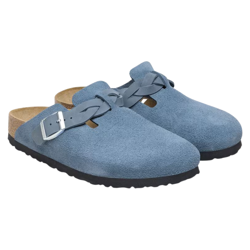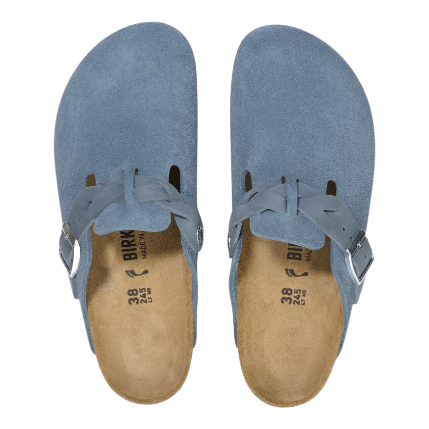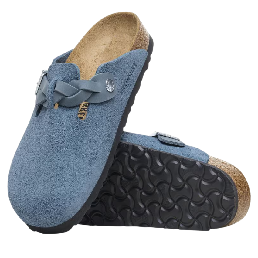 The Birkenstock Boston clog is a veritable classic that can easily be worn all year round. The colour-coordinated leather braided buckle gives this well loved design just a chic edge to complete the look. The upper is made from soft suede, with the Elemental sky Blue hue giving a unique feel, that is also so easy to pair with a range of colours and outfits.