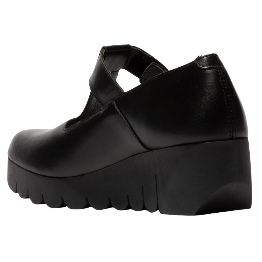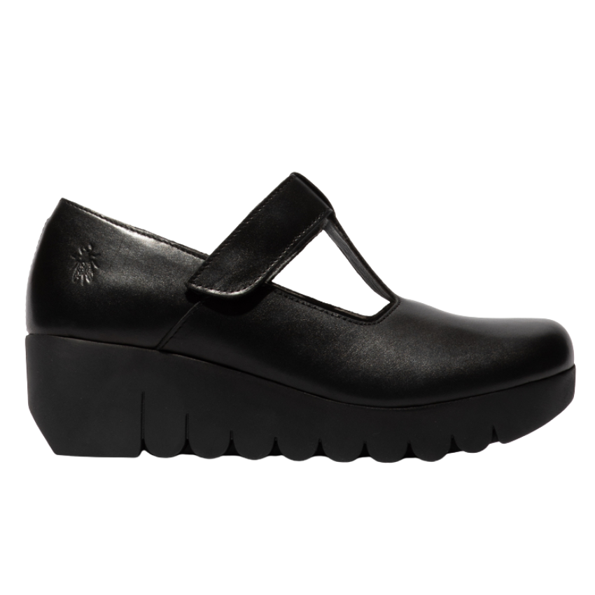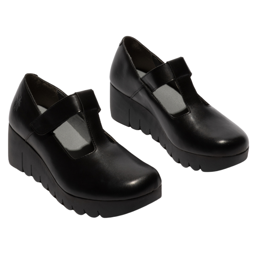 Crafted from smooth soft leather, the Veka wedge shoe features a dog tooth rubber wedge sole for effortless style. With a T-bar style covered toe area, and finished with embossed Fly London insignia and stunning soft smooth leather, these wedges can be worn all day and night. They are Secured around the ankle with an adjustable velcro strap and comfort insole.