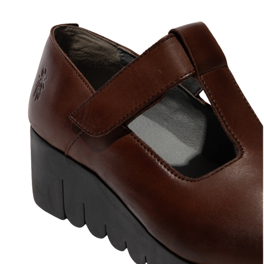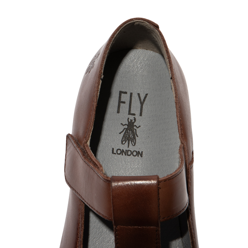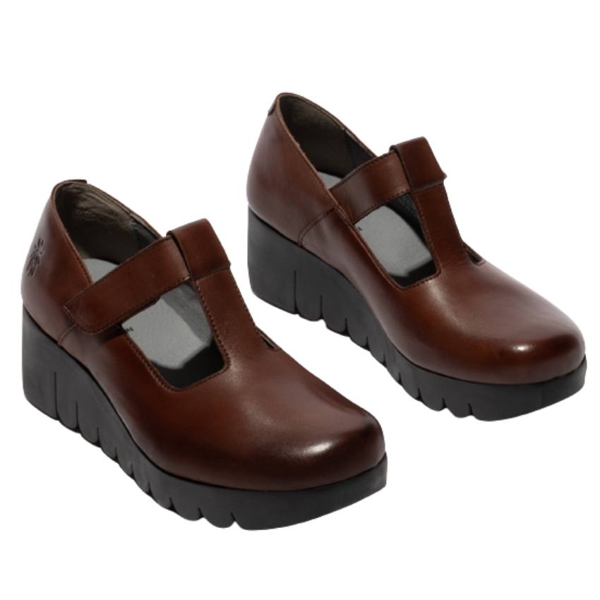 Crafted from smooth soft leather, the Veka wedge shoe features a dog tooth rubber wedge sole for effortless style. With a T-bar style covered toe area, and finished with embossed Fly London insignia and stunning soft smooth leather, these wedges can be worn all day and night. They are Secured around the ankle with an adjustable velcro strap and comfort insole.