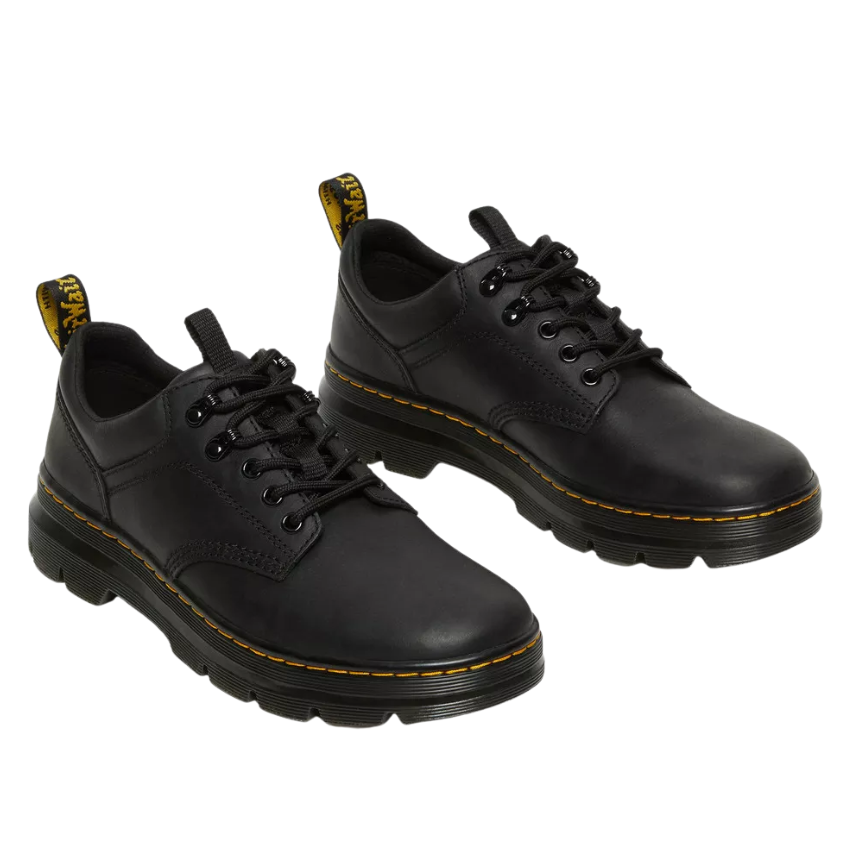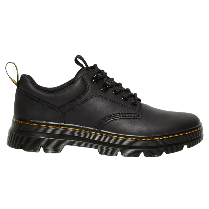 Full of Docs DNA, Reeder is fitted with hiker-style laces and finished with yellow stitching and a black and yellow heel loop. Wyoming is a rugged leather with a subtle grain and oily finish. Core Dr. Martens DNA: grooved edges, an AirWair heel loop and visible stitching. Made with a comfortable, durable cemented construction.